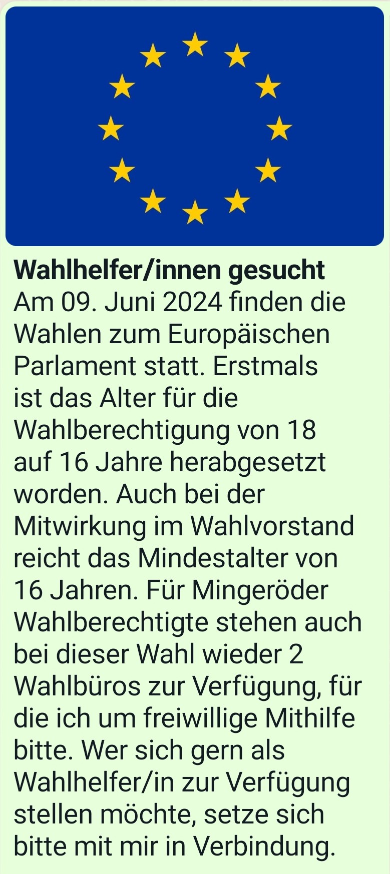 Wahlhelfer für Europawahl 2024 gesucht Wahlhelfer für Europawahl 2024 gesucht niklasschwedhelm2024-02-26T07:54:48+01:00 Seite teilen FacebookXWhatsAppPinterestE-Mail Ähnliche Beiträge Weihnachtsgruß des Ortsrates Weihnachtsgruß des Ortsrates 14. Dezember 2025 | 0 Kommentare Mingeröder Bürgerbaum Mingeröder Bürgerbaum 3. Dezember 2025 | 0 Kommentare Auszeit im Advent Auszeit im Advent 8. November 2025 | 0 Kommentare Mingeröder Weihnachtstreff am Bürgerbaum Mingeröder Weihnachtstreff am Bürgerbaum 8. November 2025 | 0 Kommentare Ehrenamtskarte für „Rentnergruppe“ Ehrenamtskarte für „Rentnergruppe“ 4. Oktober 2025 | 0 Kommentare